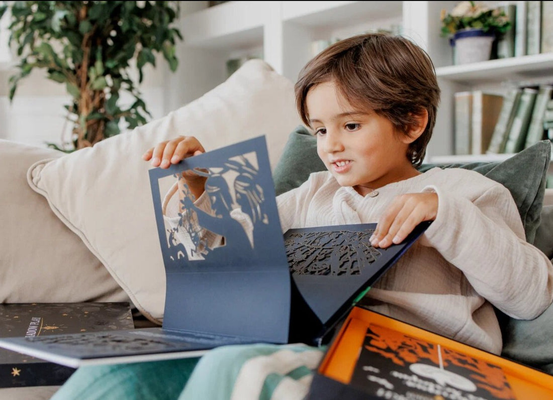 The magical book has 9 pages with laser-cut illustrations and text underneath that detail the plot of the tale.