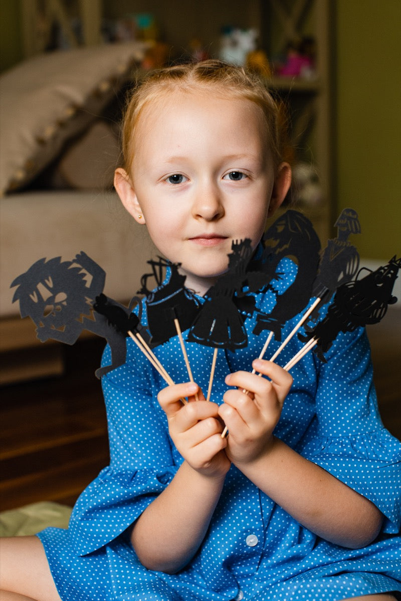 In a beautiful white or black gift box, you will find a book with up to 12 carved stages and a set of up to 20 shadow puppets. Using them you can compose as many fairytales as your imagination allows. All puppets are very diverse and there are 2 times more of them than in any other set!