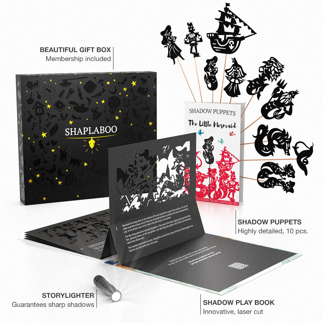 The incredibly beautiful black gift box contains an innovative book with carved illustrations, a set of shadow puppets, and a StoryLighter™ — a special flashlight that will improve your theater with clear and contrasting shadows.